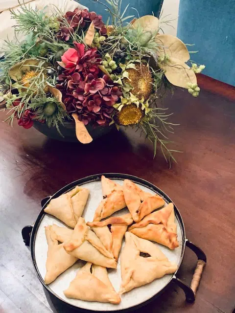 Fatayer is a meat & spinach-stuffed pie. They are small, triangular and incredibly satisfying! Fatayer starts with making AJIN – a yeasted bread dough. Here is the recipe I used. And, if you’re interested in the filling – or making fatayer, Julie Taboulie has an incredible cookbook, “Julie Taboulie’s Lebanese Kitchen. (I bought it for myself for Christmas one year!)